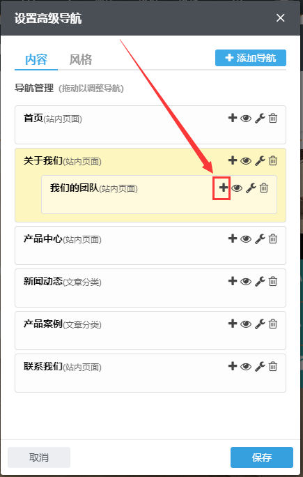 3、设置高级导航,在需要添加三级导航的二级导航处点击+;