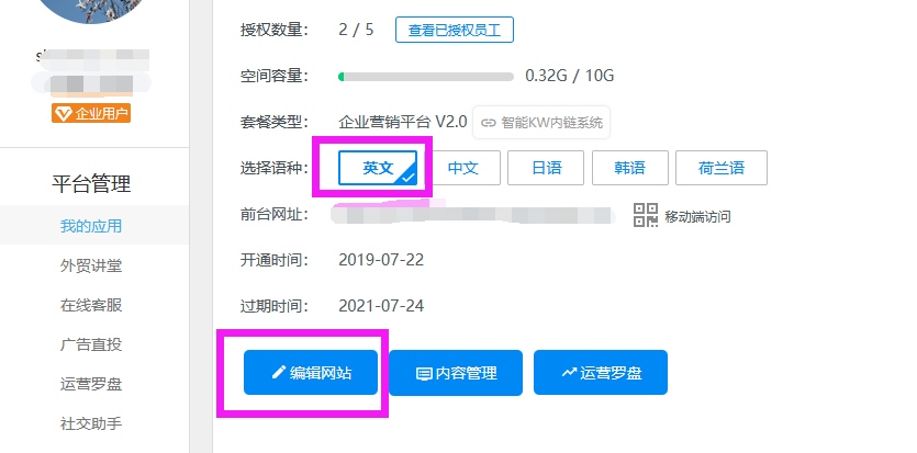 2.选择相应的语种,点击编辑网站。