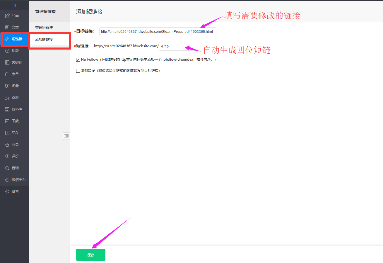 复制原长链接到目标链接内,点击保存,系统会自动生成对应短链接(短链接不支持自定义)