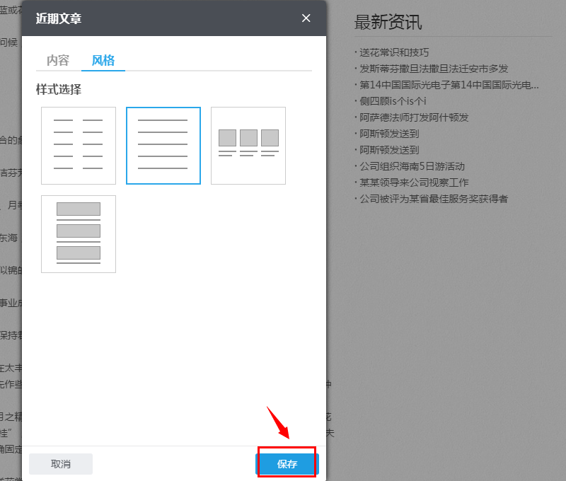 3.4 设置好近期文章组件的内容和风格后,单击设置框右下方“保存”按钮,以保存所设置的内容。