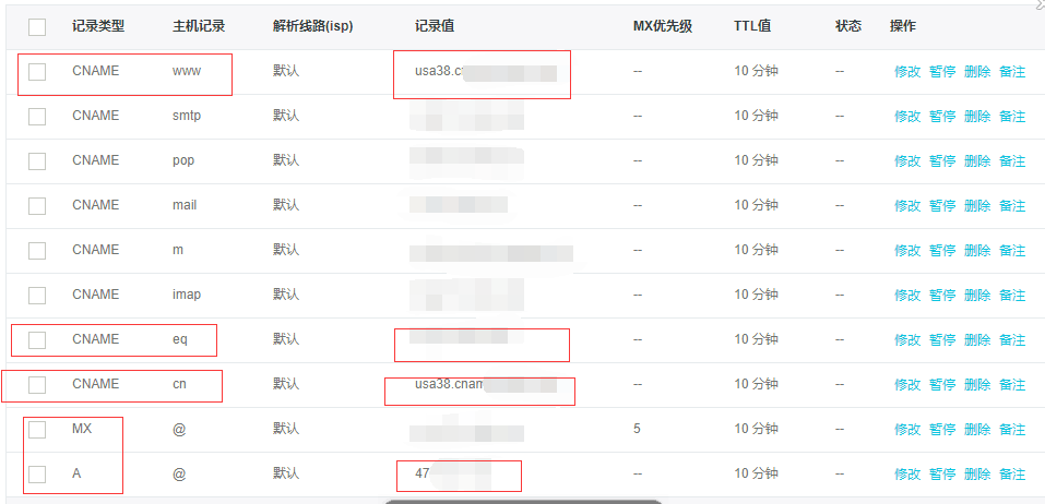 3)当遇到@的CNAME记录与MX记录冲突时,@可以使用A记录进行解析,但其他记录必须使用CNAME解析。举例:当使用此域名为后缀的企业邮箱时会出现此冲突情况。