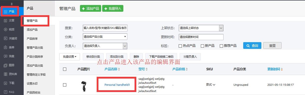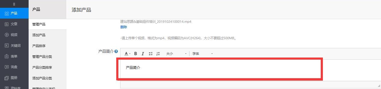 进入内容管理系统--产品管理--点击具体某个产品进入该产品的编辑界面,界面往下翻找到产品简介的编辑部分即可进行编辑,编辑完成后请记得翻到该界面的下方点击绿色保存按钮哦!如下图所示: