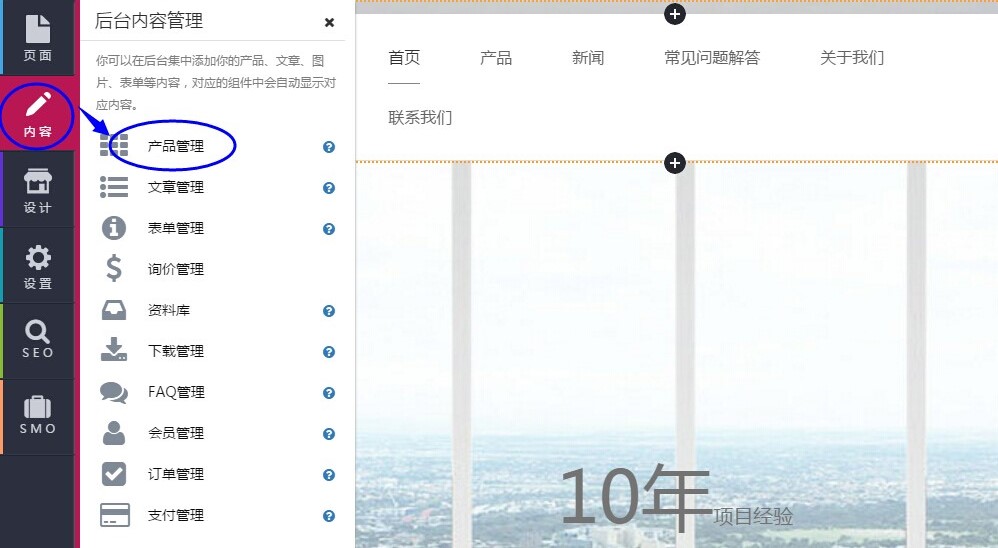 第1步:单击“内容”--》“产品管理”,默认进入“管理产品”界面;