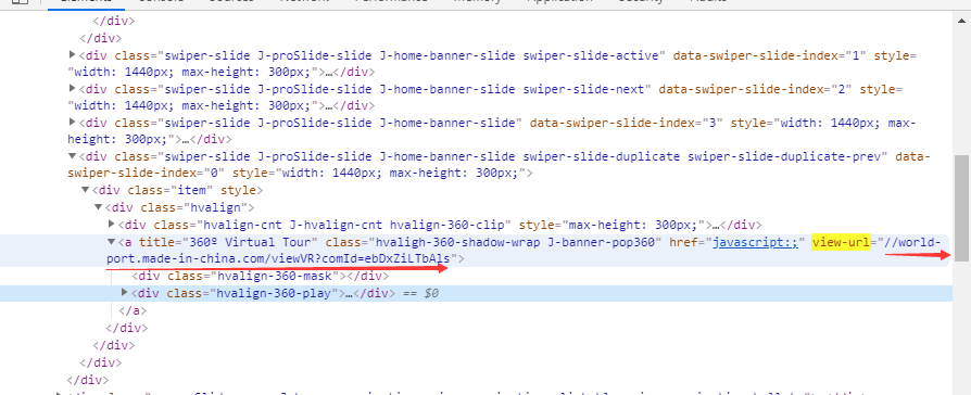 2.单击网站的360度全景图,获取到下图箭头所示代码