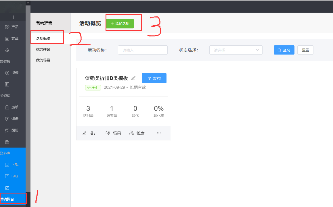 第一步:点击活动概览 ,添加活动;