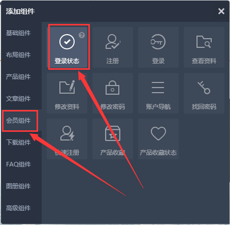 第一步:在页头找的水滴图标点击添加”登录状态”组件;
