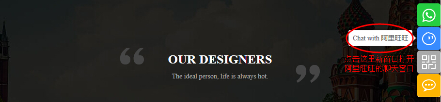 “阿里旺旺”类型,在后台“快速联系”组件中添加阿里旺旺账号,并增加提示文字告知用户这个是旺旺号码,访客点击可以直接新窗口打开web端的聊天窗口。