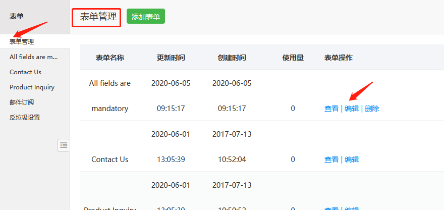 1. 单击“内容”--》“表单管理”,默认进入表单管理页面;