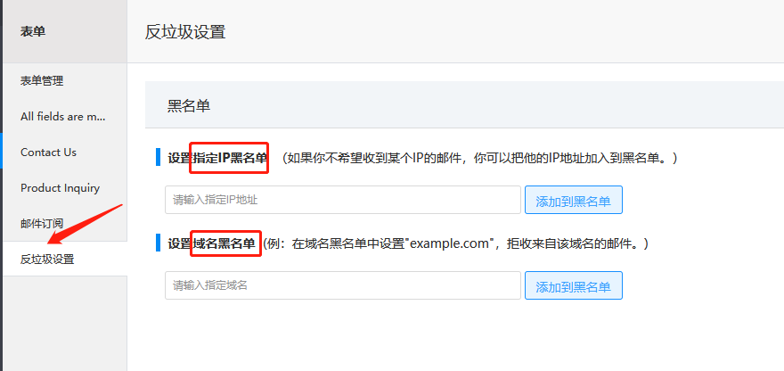 点击‘反垃圾设置’,根据页面提示写下想要加入黑名单的IP地址或者域名,就可以了。
