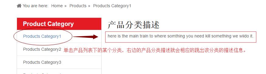 产品分类描述组件可以应用在产品总列表页面,这样,单击页面上的某个产品分类,这个产品分类的描述就会展示出来,对这类产品做个总的介绍,前台显示效果如下: