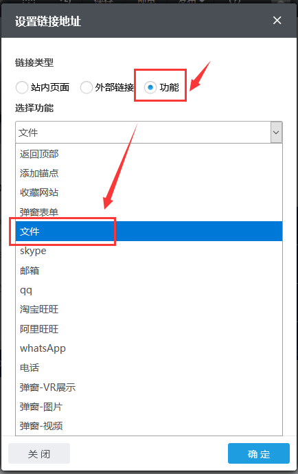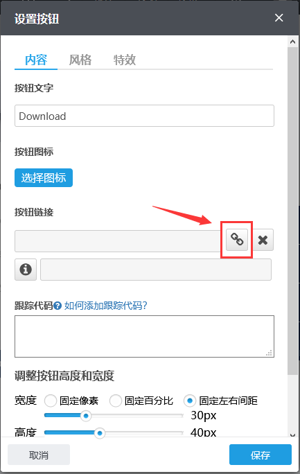 按钮链接:单击此按钮跳转的页面链接,可以通过单击下图2中的“小链子按钮”来设置,支持的链接类型有:站内页面、外部链接、电子邮件、页面锚点、产品分类、文章分类、文件,若是要跳转到网站内的某个页面,直接选择站内页面,然后在下面选择某个页面就可以;单击查看关于链接类型的详细介绍。