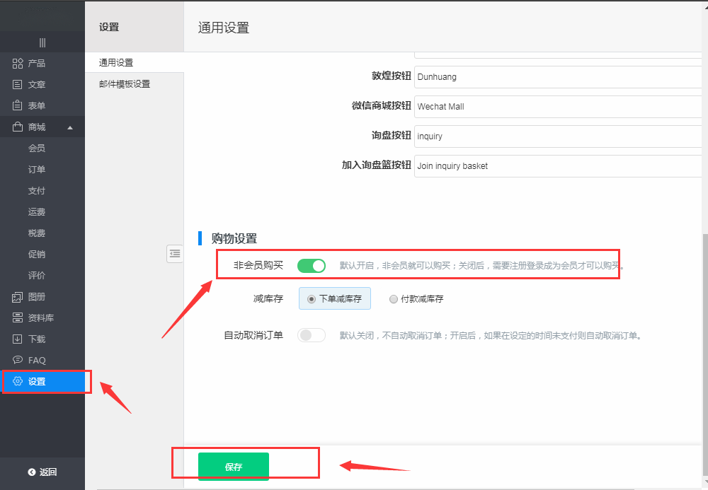 2.产品管理-》设置-》购物设置里,关闭非会员购买,这样用户在浏览网站的时候想要购买商品的时候就必须要注册后才能购买;