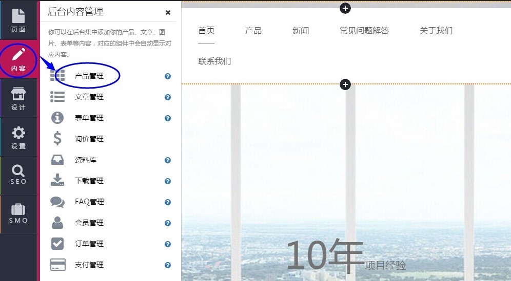 第1步:单击“内容”--》“产品管理”,默认进入“管理产品”界面;