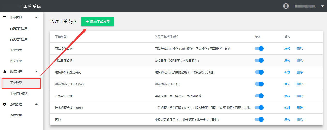 用“超级管理员”权限的账号登录系统,进入工单系统,点击左侧菜单-》数据管理-》工单类型。