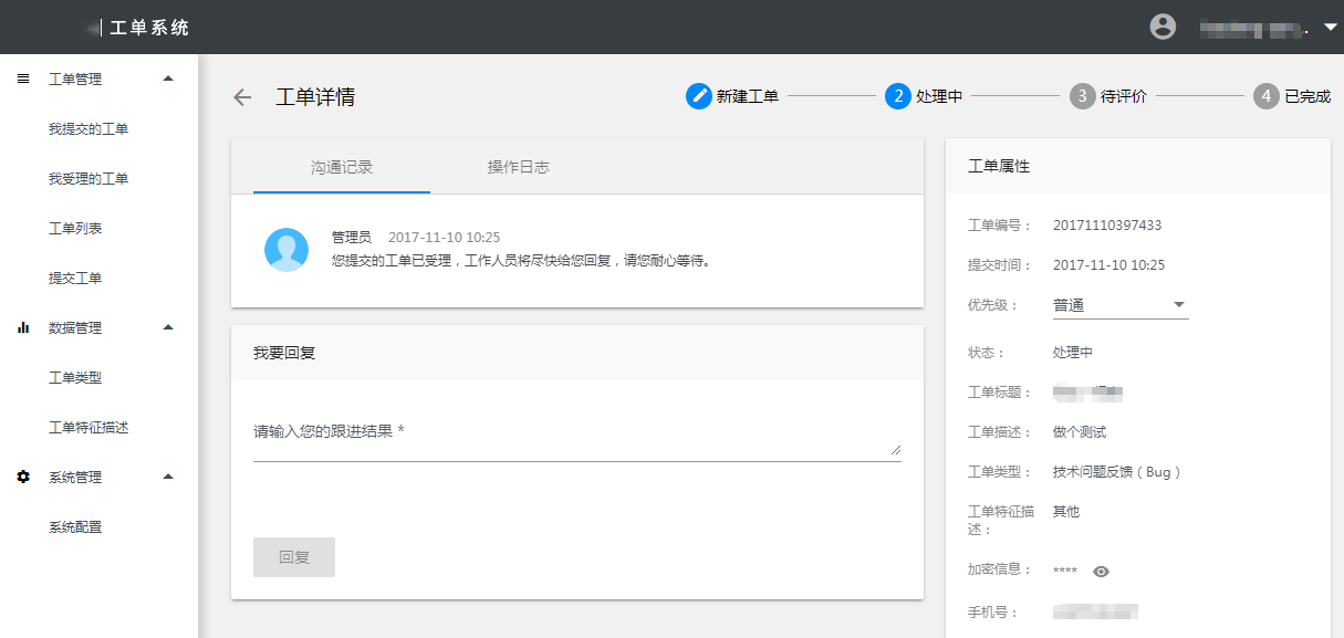 在以上界面点击操作项的【查看】操作,进入工单详情。右上角显示工单的状态的进度情况,在“沟通记录”页签下可以看到客服与用户的历史沟通记录,切换到“操作日志”页签可以查看该工单的任何操作的记录,右侧“工单属性”模块显示该工单的基本信息。