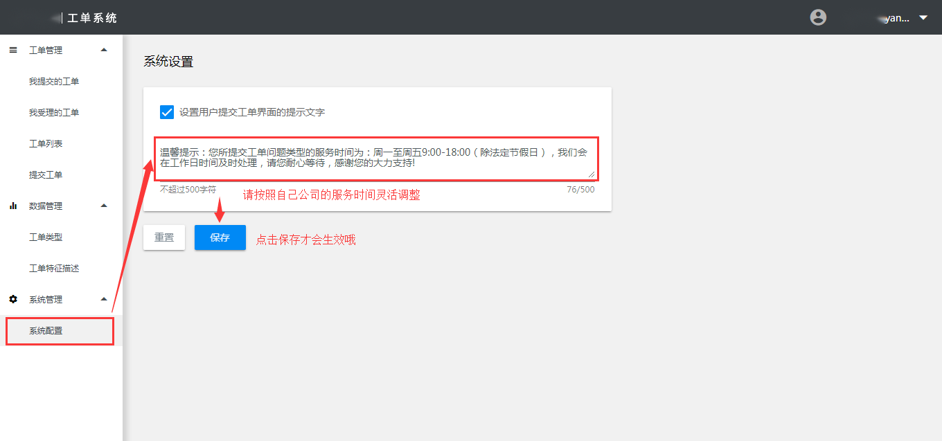 请每个公司针对企业自身服务时间灵活调整这句话,然后点击页面的【保存】按钮生效,这里设置后,在用户端提交工单页面上方就会显示这段提示文字,让用户能够真实知晓您的服务能力。