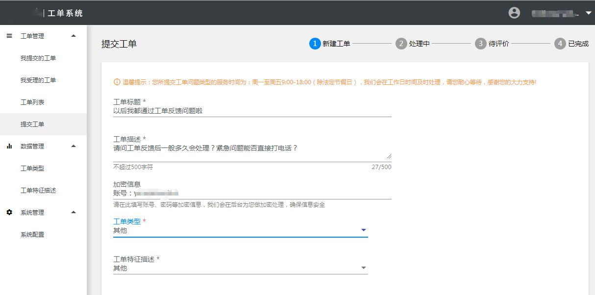 需要填写工单标题、工单描述、加密信息(账号密码等私密信息请通过这个字段填写,会加密存储,避免账号信息泄露)、选择工单类型和工单特征描述、填写手机号码、邮箱、姓名、如有界面等还可以通过附件上传。