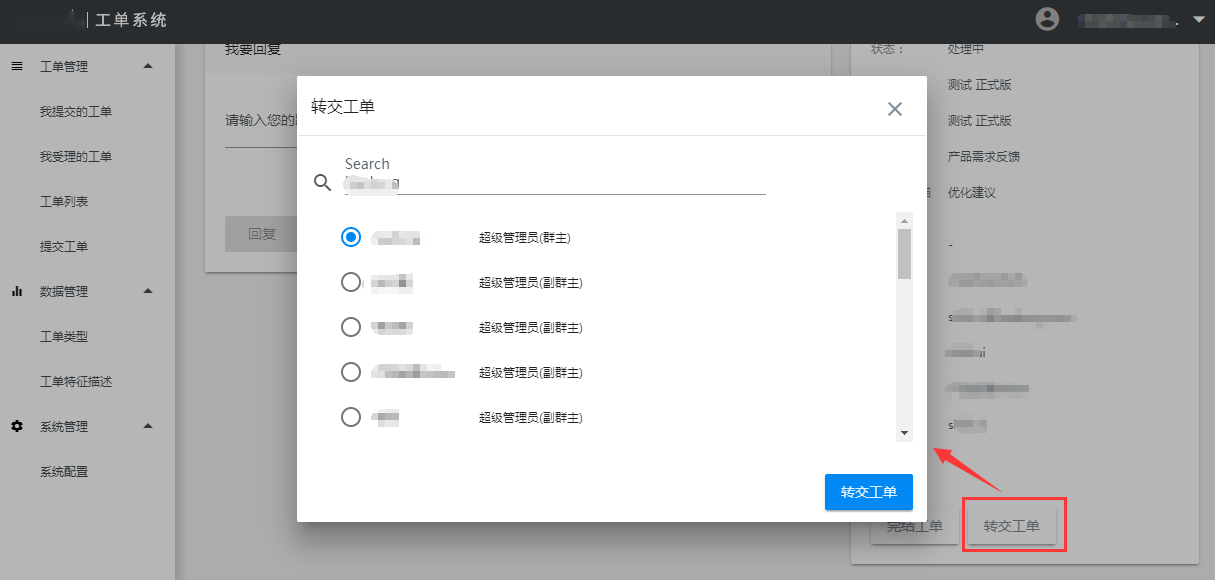 当服务商处理不了此工单,需要转交给其他客服人员处理时,就需要在工单详情执行【转交工单】操作,工单转交后,就分配给了转交给的客服人员,在我受理的工单中就看不到此工单了。