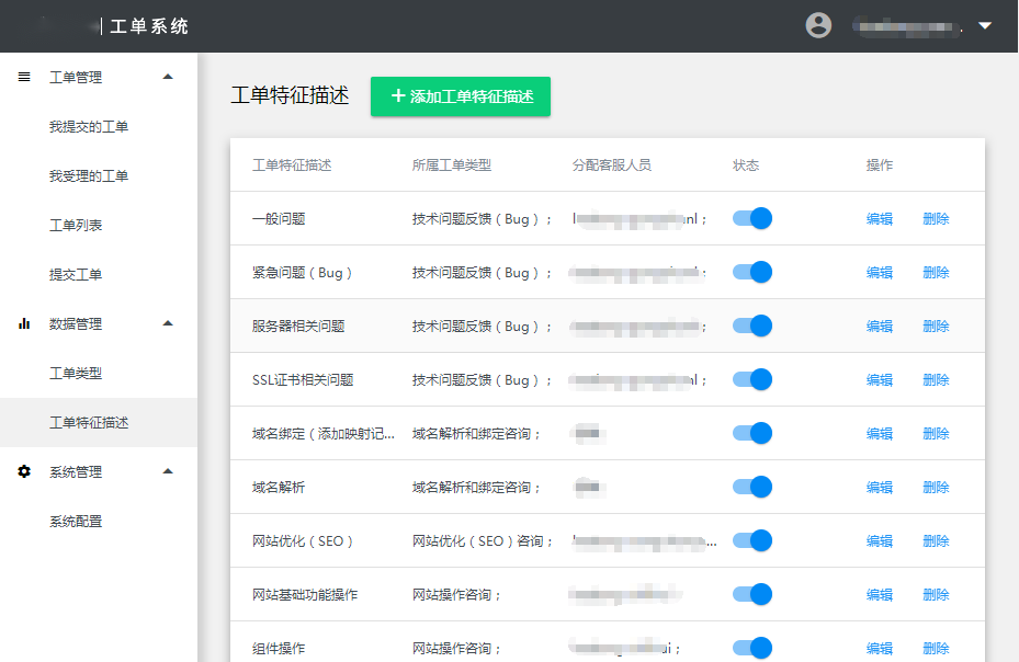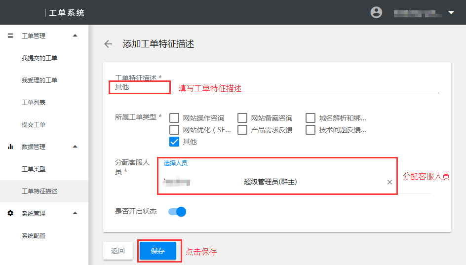 客服端-》左侧菜单-》数据管理,这个权限只有主账号以及拥有“超级管理员”权限的子账号才能看到,也就是说针对“工单类型”和“工单特征描述”的数据配置只有管理员权限的账号才能操作。