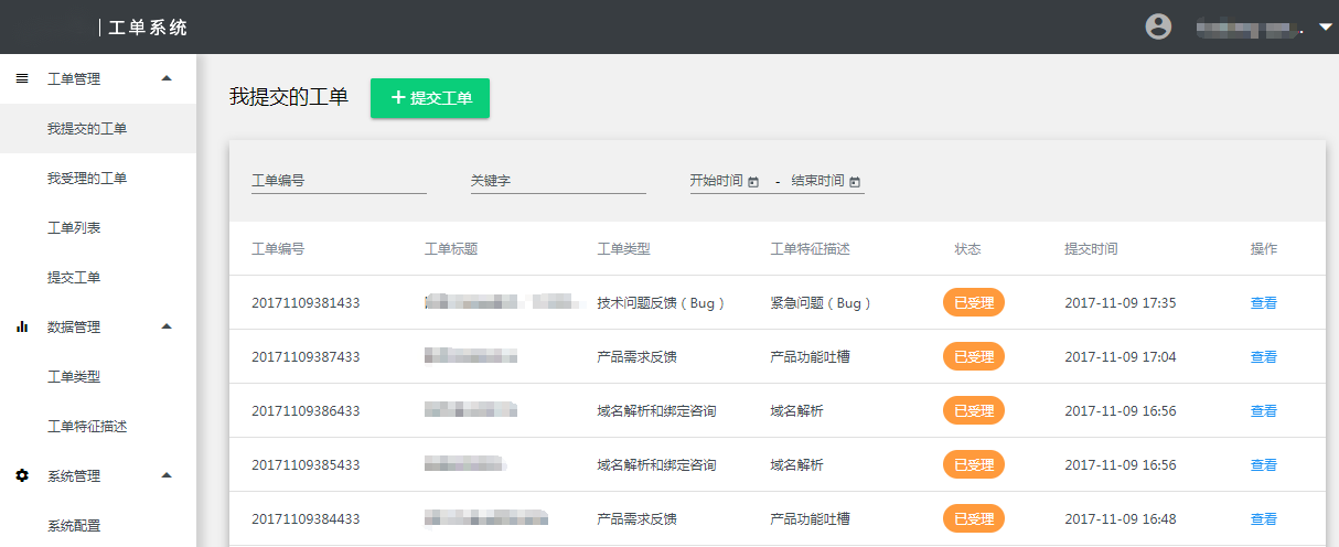服务商账号登录系统,进入工单系统,点击左侧菜单-》工单管理-》我受理的工单,可以查看用户提交所有工单的列表。
