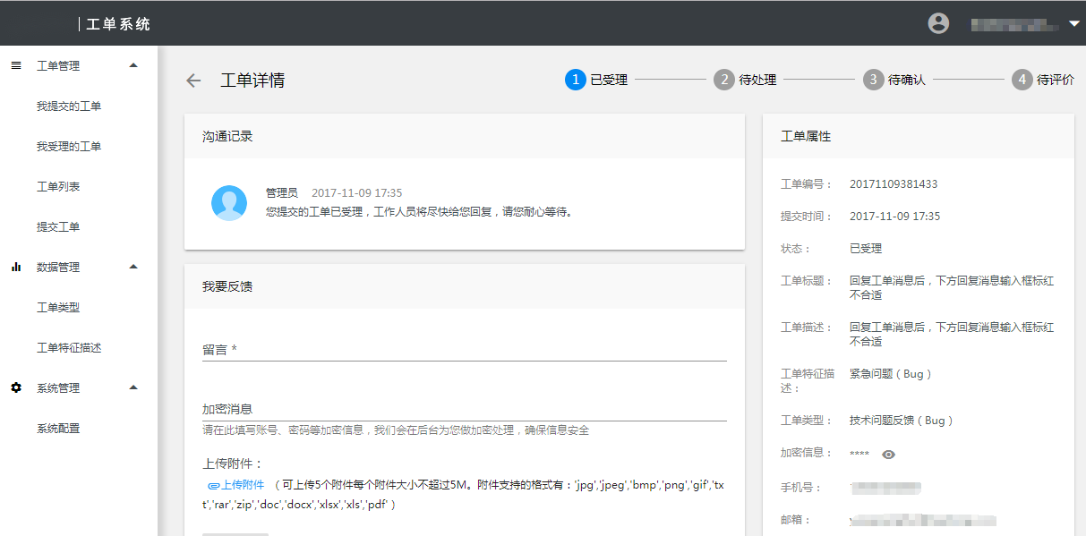 在以上界面点击操作项的【查看】操作,进入工单详情。右上角显示工单的状态的进度情况,在“沟通记录”页签下可以看到服务商与支点的历史沟通记录,右侧“工单属性”模块显示该工单的基本信息,工单详情如下界面所示: