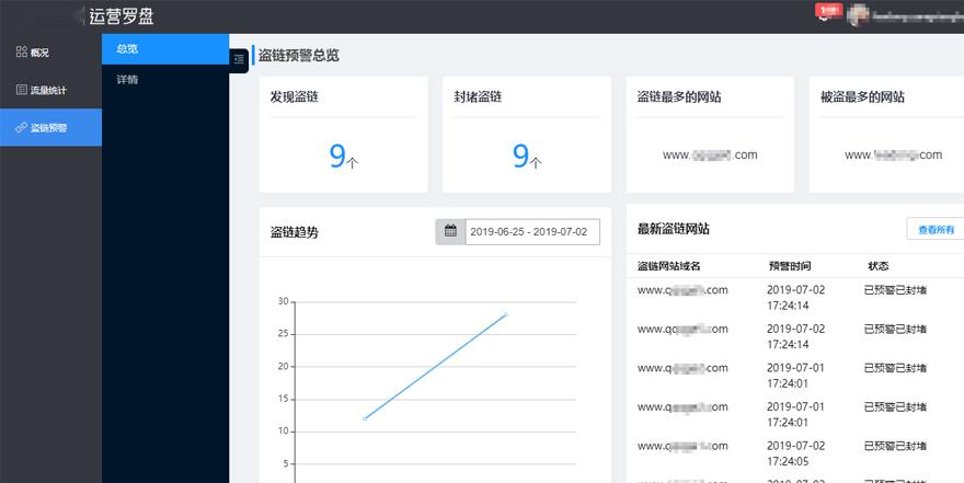 为了防止他人盗取网站资源的链接进行恶意的使用,支点系统后台新增了一个防盗链预警功能用于查看网站及语种的盗链情况(若您的网站未检测出盗链数据说明网站很安全)。点击运营罗盘下的盗链预警,即可查看盗链预警总览,如下图所示:
