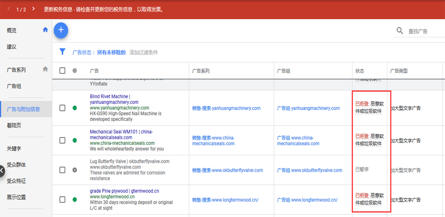 1)导致正版网站谷歌广告投递被拒登;如下图所示: