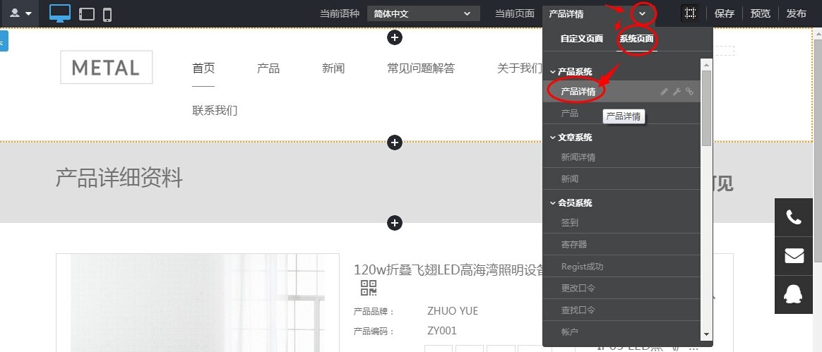 第1步:把系统页面“产品详情”切换为当前页面;