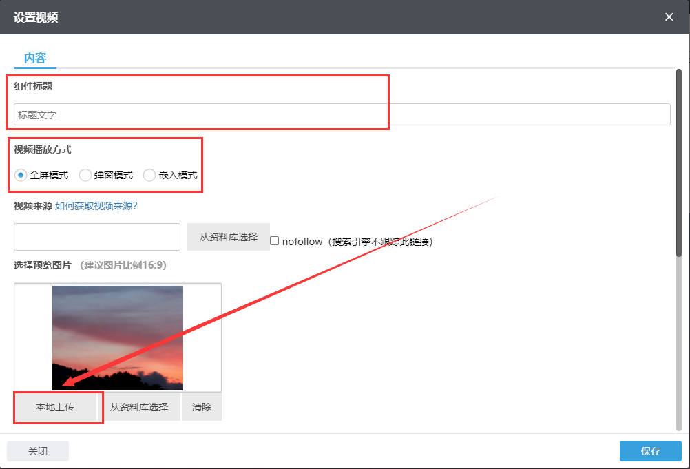 视频播放方式:支持全屏模式、弹窗播放或嵌入播放;具体播放区别可根据需求选择
