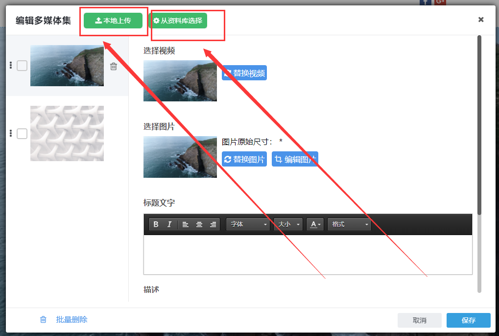 3、首先把已有的模板视频删除,然后本地上传视频,从资料库选择已上传的视频;完成后可设置标题文字、描述等;
