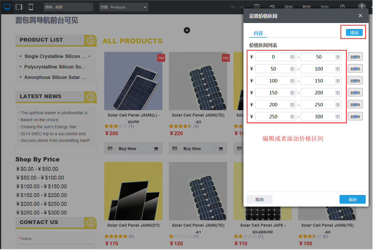 如果商家希望在产品页面增加价格筛选方式,方便访客快速通过价格区间筛选产品,可以添加新的shop by price组件。商家可以自己添加不同的价格区间,数量不限,添加几个在前台就显示几个区间的价格筛选条件。