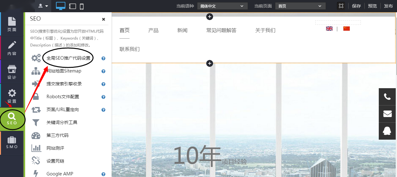 第1步:单击“SEO”--》“全局SEO推广代码设置”;