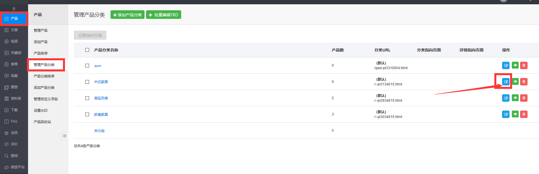 2、单击“管理产品分类”,找到要修改的这个产品分类,单击后面的编辑按钮;