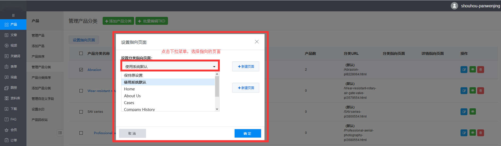 第三步:设置产品分类指向页面,通过设置产品分类指向页面,可实现点击该产品分类后可跳转至自定义页面。