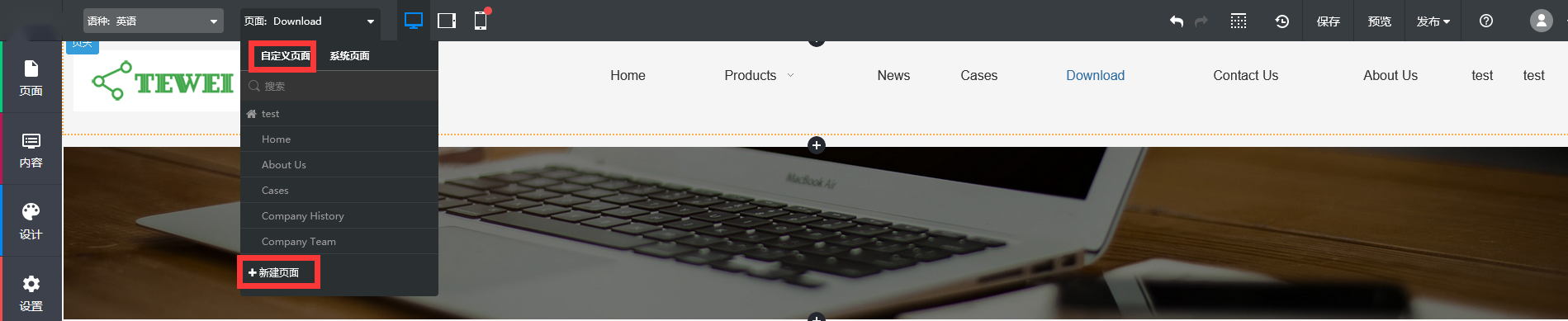 第二步:在新的页面中添加您需要添加的组件或者区块,例如产品分类组件、产品列表组件等