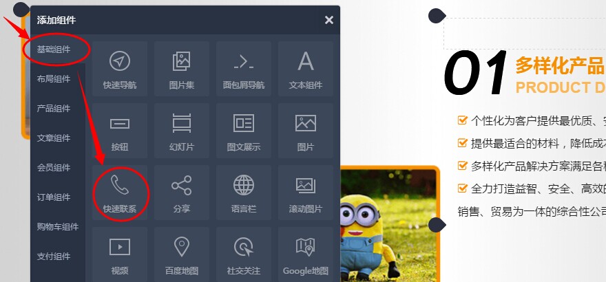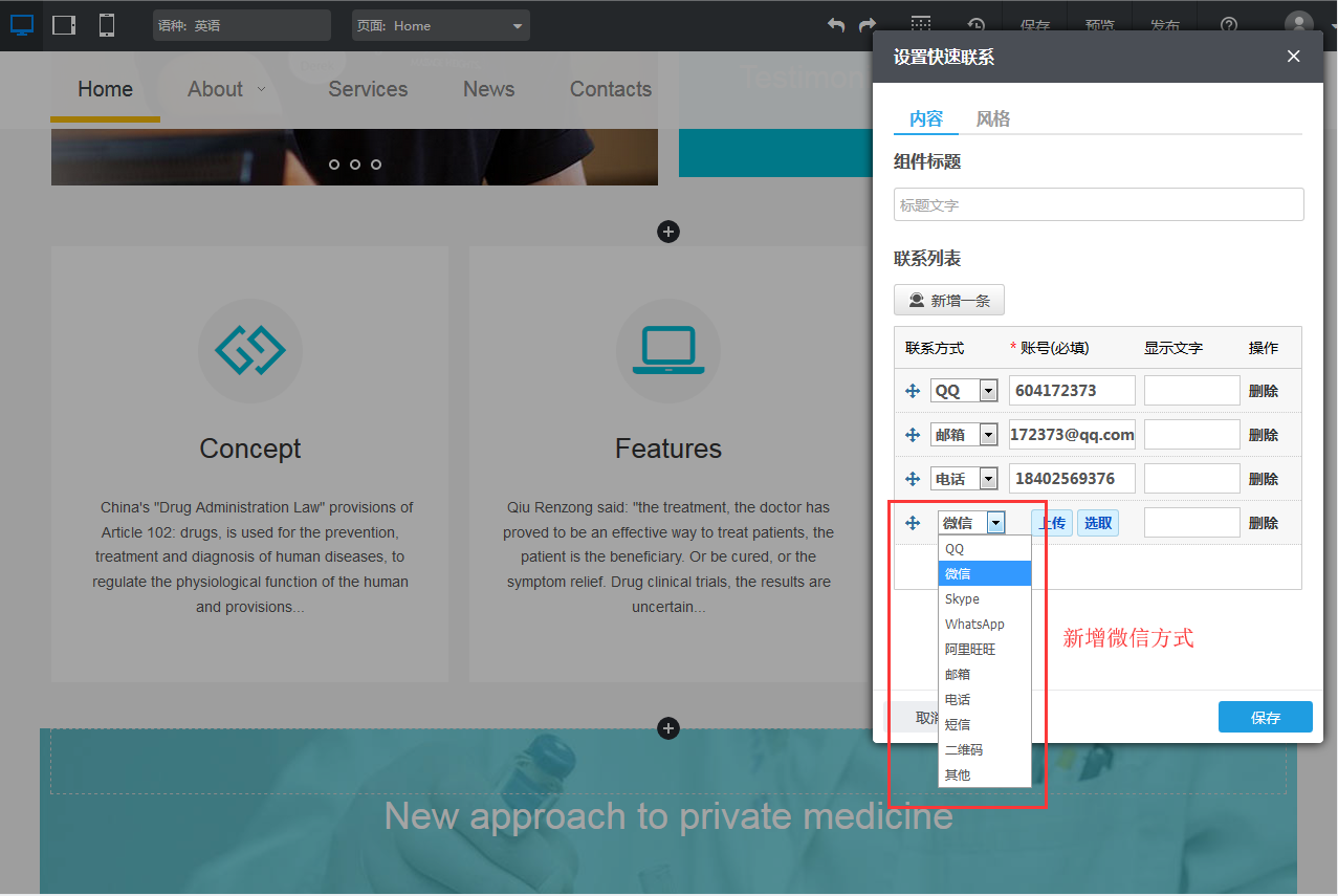 【操作方式】登陆进入支点云-》编辑网站-》快速联系组件设置-》新增联系方式-》选择微信。