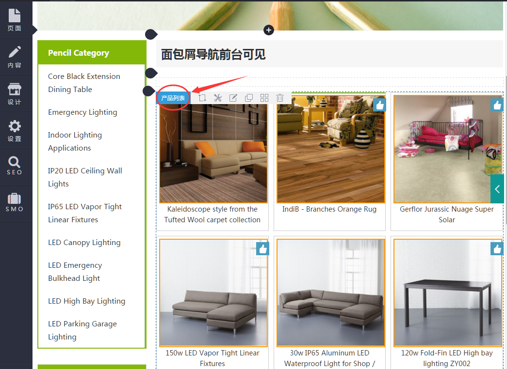 在当前页面,把鼠标放到产品图片变形的区域,这个区域左上角会出现几个字即为这个组件的名称“产品列表”,即可表示这块内容是使用产品列表组件制作的。