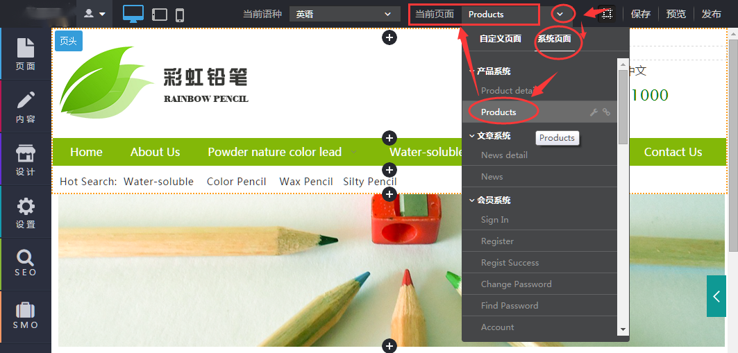 找到变形的产品图片所在的页面,把它切换为“当前页面”;以Products页面为例,如下图所示即可把这个页面切换为当前页面;