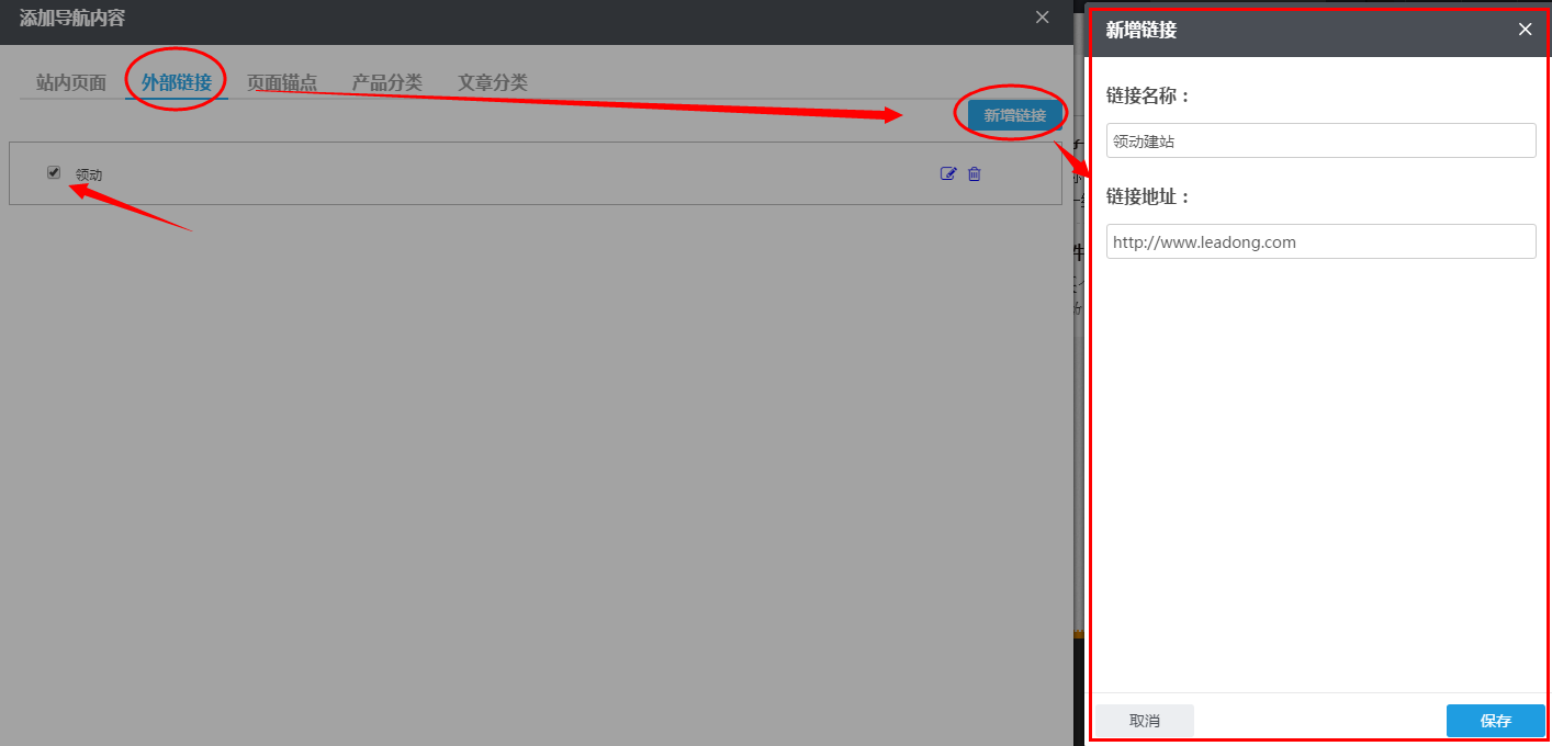 操作步骤:单击“外部链接”--》单击“新增链接”--》输入链接名称以及链接地址(带http://)--》保存--》在链接名称前面打勾(如下图7)。
