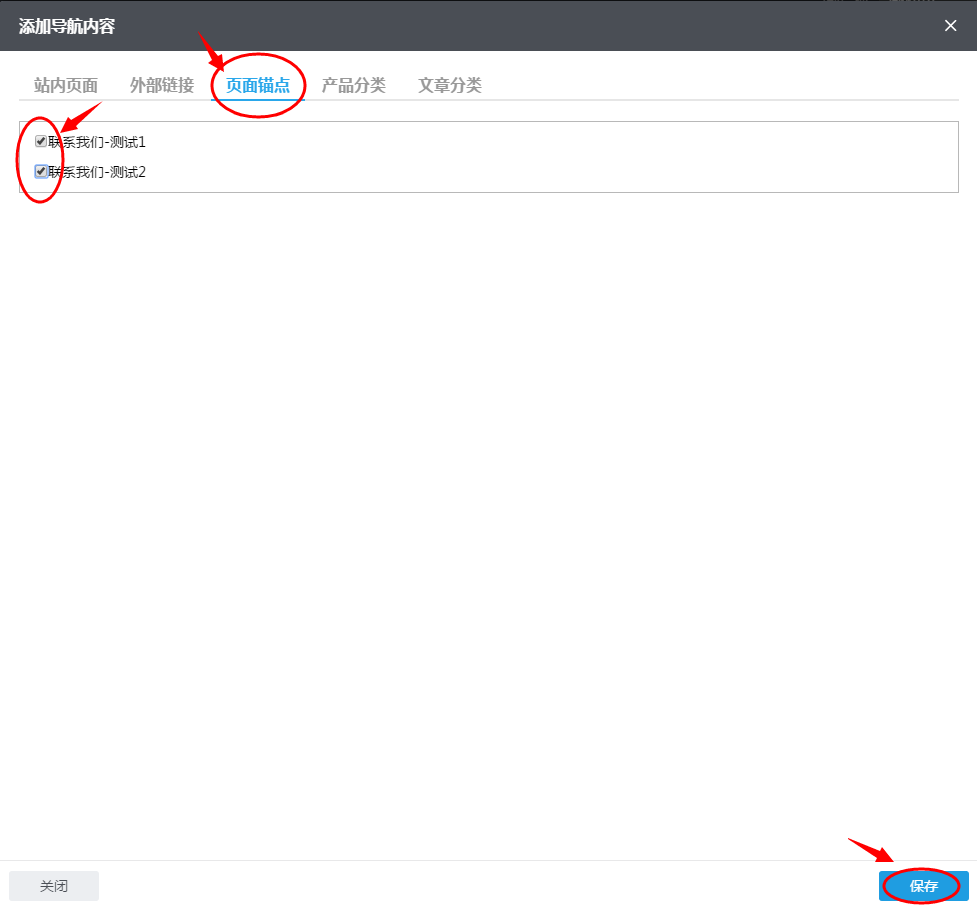 单击上图4中“批量添加导航”,弹出可添加的内容,支持添加的导航类型有:站内页面、外部链接、页面锚点、产品分类、文章分类,详细内容如下: