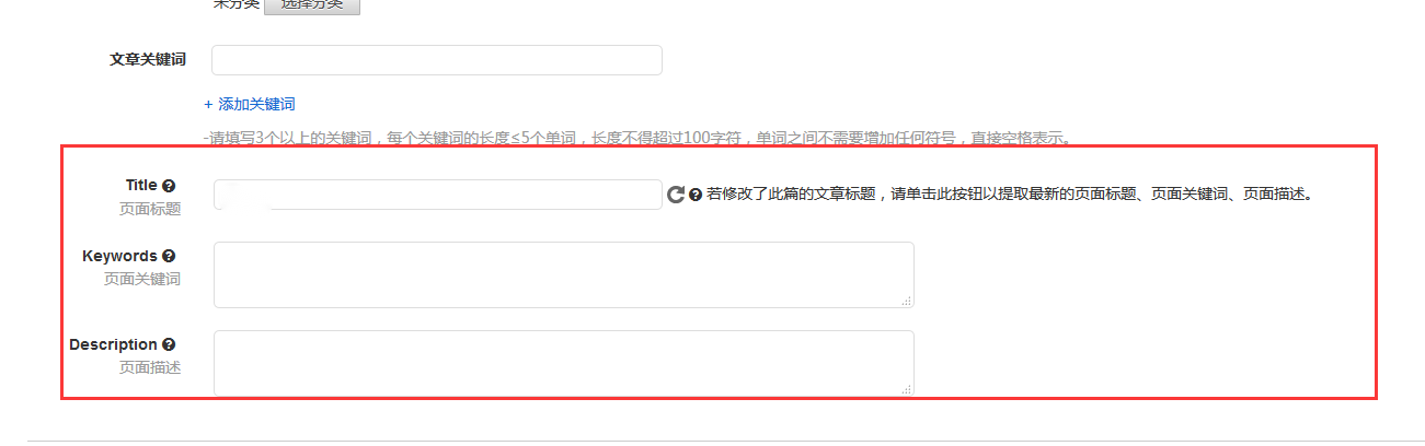3、在这篇文章编辑页面中部,我们可以看到搜索引擎优化,在这里可以修改这篇文章的TITLE页面标题、KEYWORDS页面关键词、DESCRIPTIONG页面描述。