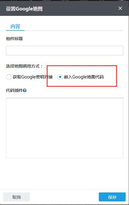 5、在设置Google地图组件里,选择嵌入Google地图代码,然后把复制好的代码粘贴在下图的编辑框里,保存后返回编辑页面保存并预览;