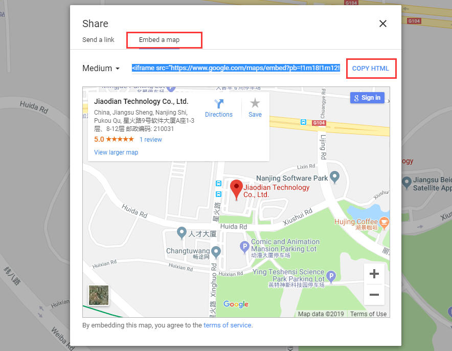 3、点击分享按钮后,选择“嵌入地图”,并点击“复制HTML”按钮;
