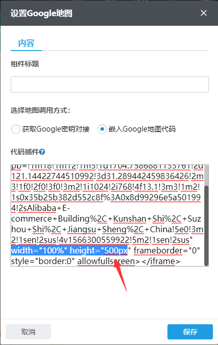 7、如果需要修改谷歌地图高度,可把width="100%" height="100%"改成width="100%" height="500px"或其它后缀为px的像素值;
