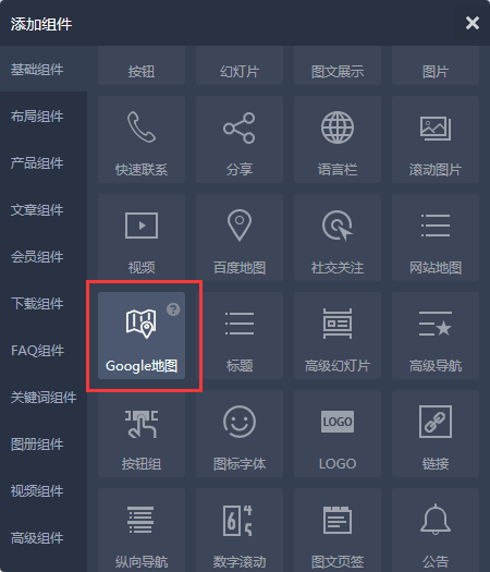4、把复制好的链接添加到网站后台,在需要添加地图的页面和地图展示具体位置添加基础组件,在基础组件里选择“Google地图”组件;