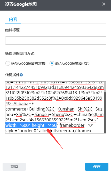 6、如果需要调整地图长度,可在下图所示代码里修改width="600" height="450"改为:width="100%" height="100%",这样设置后可增加Google地图长度,当这一行只有地图时这样展示更美观,具体修改入口如下图所示;