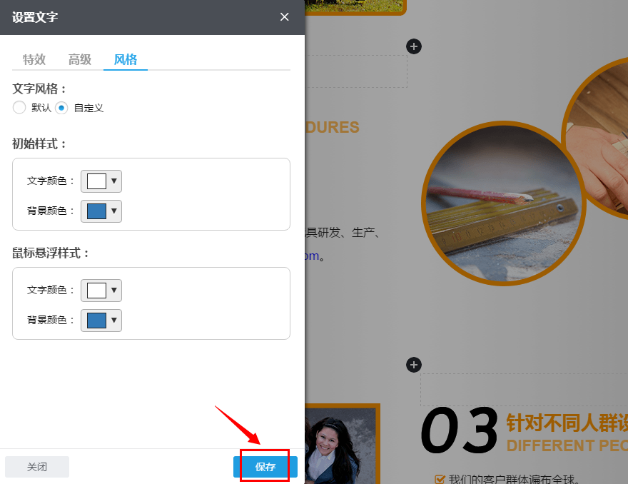 3.6 设置好文本组件的特效。高级功能和风格后,单击设置框右下方“保存”按钮,以保存所设置的。