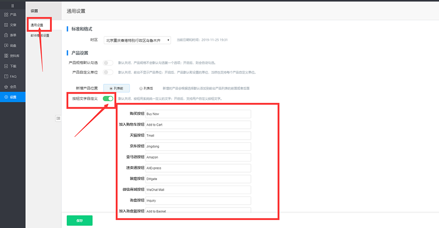 2) 选择“通用设置”,进入会看到产品设置中有“按钮文字自定义”,点击绿色按钮,将需要修改的按钮文字进行更改。(注:更改后只需保存即可,无需发布便可展现修改后的结果,若您看到的效果是修改前的,请直接刷新页面即可生效。)