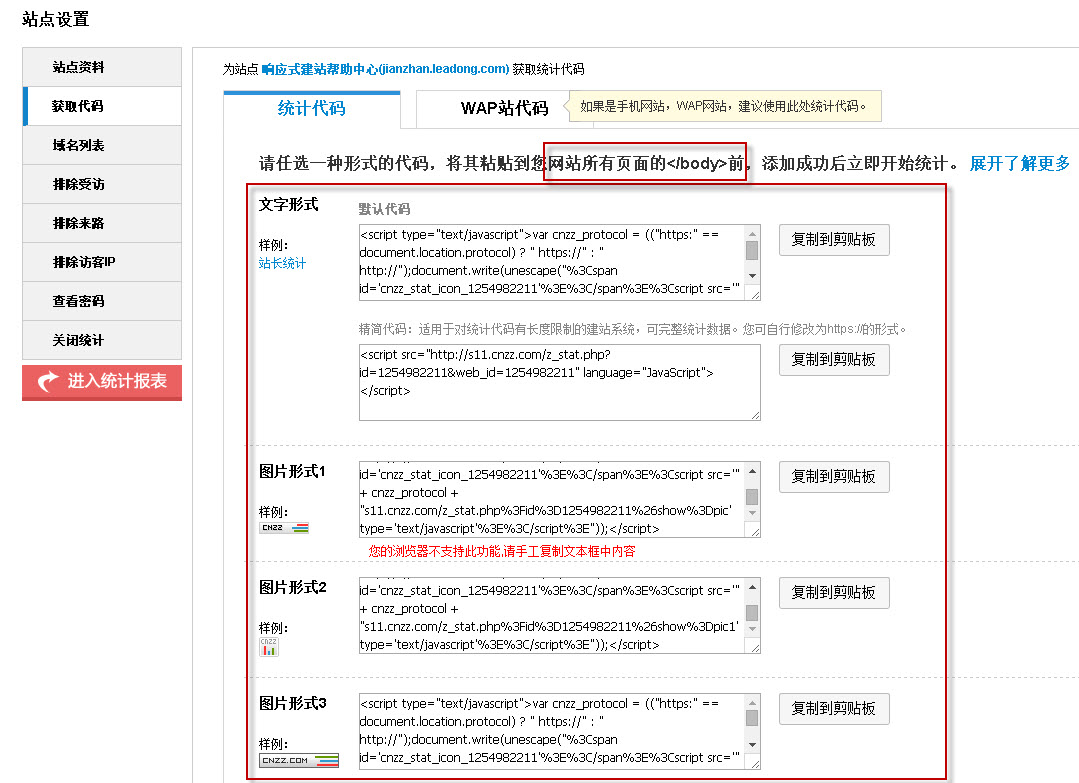 2、在CNZZ上添加站点,即把使用领动所建的网站添加到CNZZ中;