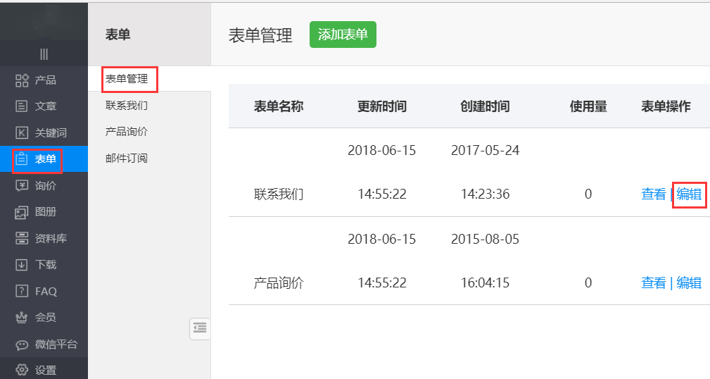 2、在表单管理页面,找到要编辑的表单,单击后面的“编辑”按钮;